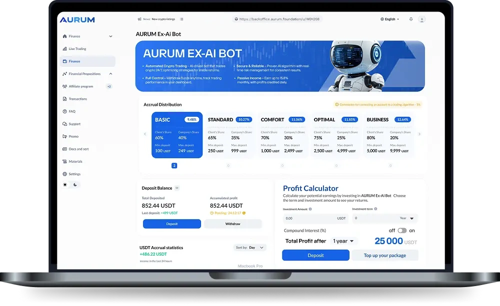 Create your AURUM account, access the secure back office, and deposit supported digital assets. Your funded balance becomes the structured trading capital managed by the AURUM EX-AI BOT under predefined execution logic.